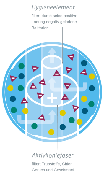 Dans la cartouche, une combinaison de différents types de filtre assure l’excellente qualité du nettoyage, sans causer une baisse de pression importante dans le système. Au cours de la première étape, le filtre à charbon actif supprime la turbidité, les particules en suspension et les odeurs. Ensuite, l’élément hygiénique spécialement développé élimine les bactéries à l’aide du procédé à membrane sélectif.