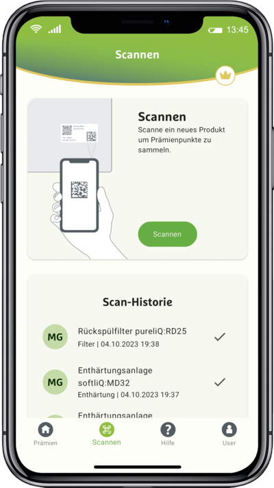 Per ogni prodotto Grünbeck acquistato riceverete punti preziosi che potrete convertire in un filtro pureliQ di alta qualità. Potete scegliere tra il filtro a candela con riduttore di pressione pureliQ:KD o il filtro a risciacquo con riduttore di pressione pureliQ:RD. Anche l'impianto di addolcimento softliQ:SD18 può essere ottenuto come premio. Come funziona? Molto semplice: Utilizzate l'app "Grünbeck Wassermeister" (per iOS e Android) sviluppata appositamente per i professionisti dell'acqua per scansionare il codice QR sulla confezione di uno degli oltre 100 prodotti Grünbeck scansionabili.