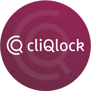 Ein runder, burgunderfarbener Kreis enthält den weißen Text „cliQlock NEU für softliQ:SE“.