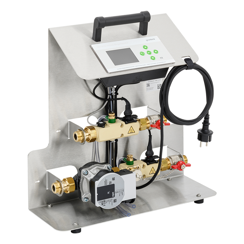 Der ergonomische Tragegriff und das geringe Gesamtgewicht von unter 10 kg ermöglichen einen komfortablen Transport des desaliQ Inline-Regelmoduls an den Einsatzort. Trotz minimalen Gewichts setzt Grünbeck auf maximale Leistung: Mit dem desaliQ Inline-Regelmodul können Anlagen mit einer Wassertemperatur bis zu 80 °C während des laufenden Betriebs aufbereitet werden. Die hohe Umwälzleistung sorgt darüber hinaus dafür, die Aufbereitungsdauer auf ein Minimum zu reduzieren.